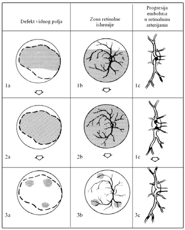 Progresija emboluza u retinalnim arterijama prikazana je u trećem redu