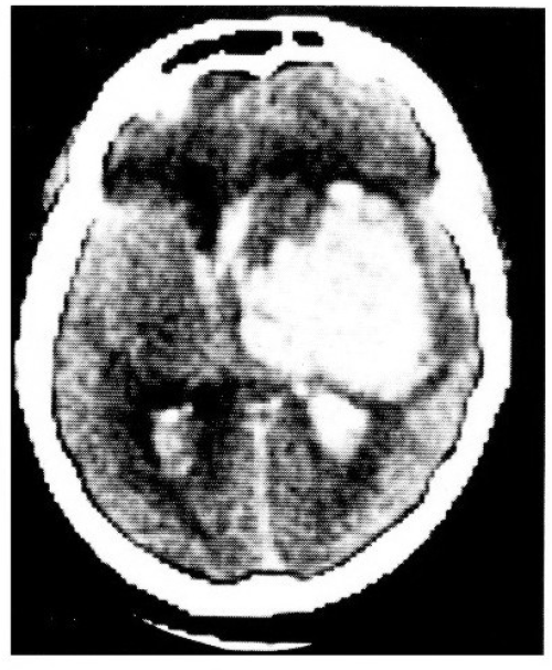Masivna hemoragija u predelu bazalnih ganglija (desno) sa krvarenjem u obe lateralne moždane komore.