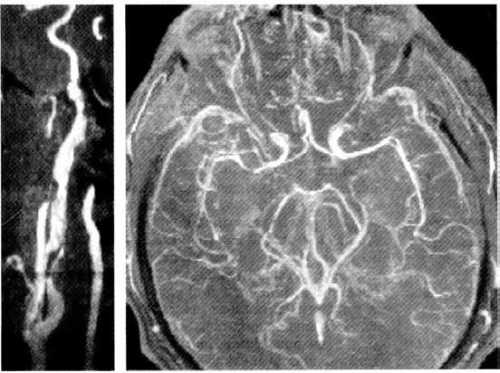 MAGNETNA REZONANSA SUPRAAORTALNIH GRANA (MRI arteriografija) je moderna i neinvazivna metoda. Jeftinija je od klasične arteriografije. Međutim slaba rezolucija u slučaju teških (multiplih) lezija supraaortalnih grana, značajno limitira njenu primenu. U kombinaciji sa Duplex-sonografijom može da zameni MSCT arteriografiju, pošto uspešno prikazuje lezije tipa elongacije, kinkinga, coilinga i disekcije. MRI arteriografija može da diferencira fibromuskularnu displaziju od arterijske disekcije i hipoplazije arterija sa tipičnom slikom brojaničnih stenoza (“string of beads”). MRI arteriografija može da otkrije tromb u nivou septalne formacije unutrašnje karotidne arterije. Brzina i neinvazivnost MRI arteriografje proširuje mogućnosti dijagnostičke evaluacije i drugih arterija, naročito bubrežnih.