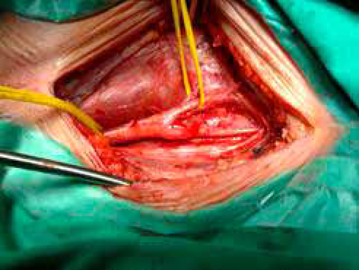 Poststenotično hipoplastična, skoro okludirana ACI, koja se vraća na normalan kalibar nakon endarterektomije
