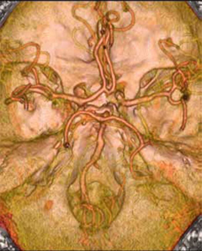 Cerebralna MSCT arterigrafija prikazuje teško deformisani willisov poligon sa doliho mega bazilarnom arterijom uz muralnu trombozu, sa okludiranom desnom vertebralnom arterijom