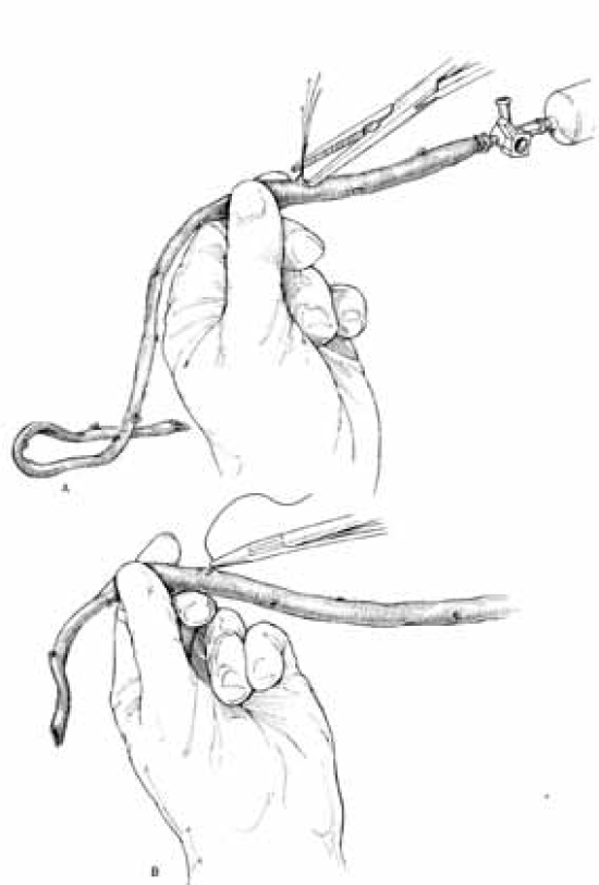 Atraumatska priprema autovenskog grafta (vena saphena magna). Dozirana segmentna dilatacija vene fiziološkim rastvorom ukazuje na bočne grane koje treba ligirati ili suturirati.
