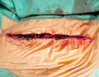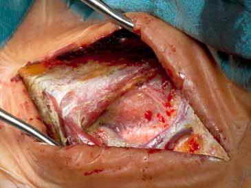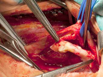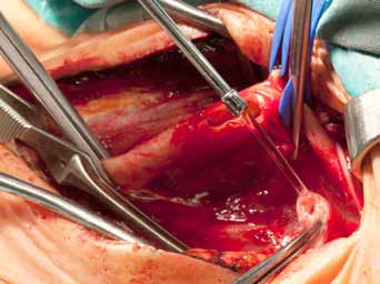 Poprečna transekcija unutrašnje karotidne arterije u nivou karotidne bifurkacije. Detalj: započinjanje everzione endarterektomije unutrašnje karotidne arterije ulaskom u sloj izmedju obolele medije i očuvane adventicije sa spoljašnjom elastičnom laminom.