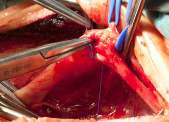 Završetak anastomoze na prednjem zidu ACI. Lijatura produžnog evertirajućeg šava.