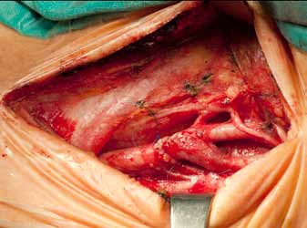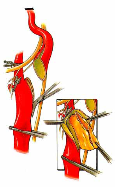 Endarterektomija unutrašnje karotidne arterije: nakon presecanja karotidne arterije se identifikuje sloj za izvođenje endarterektomije (lamina elastica externa). U sloju gde se aterosklerotični plak sam odvaja od adventicije (cleavage plane) odstranjuje se plak posuvrtanjem unutrašnje karotidne arterije uz istovremenu trakciju aterosklerotičnog cilindra.