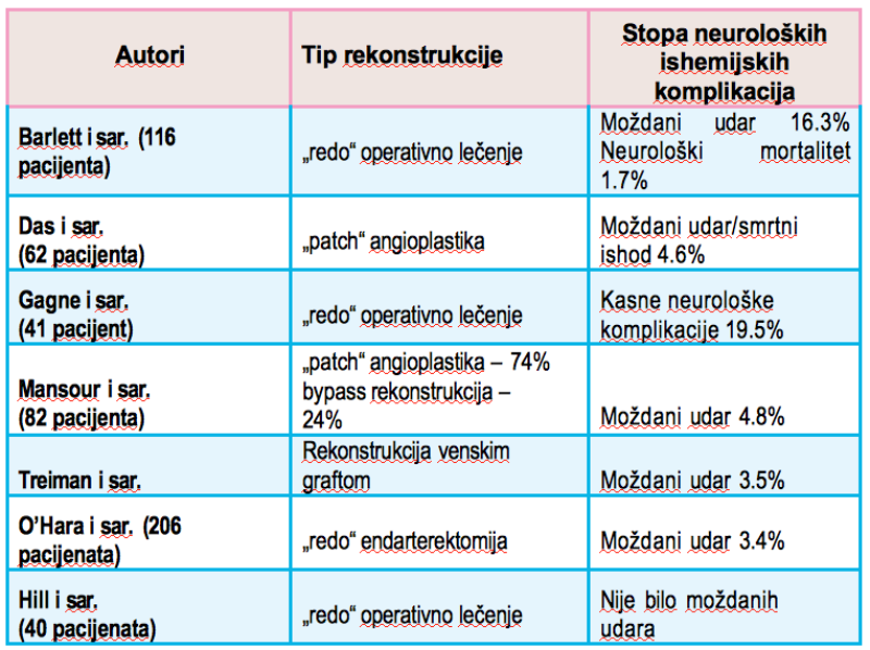 Endarterektomija karotidne bifurkacije ima bolje rane i udaljene rezultate u odnosu na druge lokalizacije i druge vrste revaskularizacija. “Karotidna endarterektomija dugoročno daje dobru prolaznost arterije”. Hirurška tehnika kod primo-operacije je svakako najvažnija u prevenciji restenoza. Terapiju statinima treba započeti što ranije pre operacije.